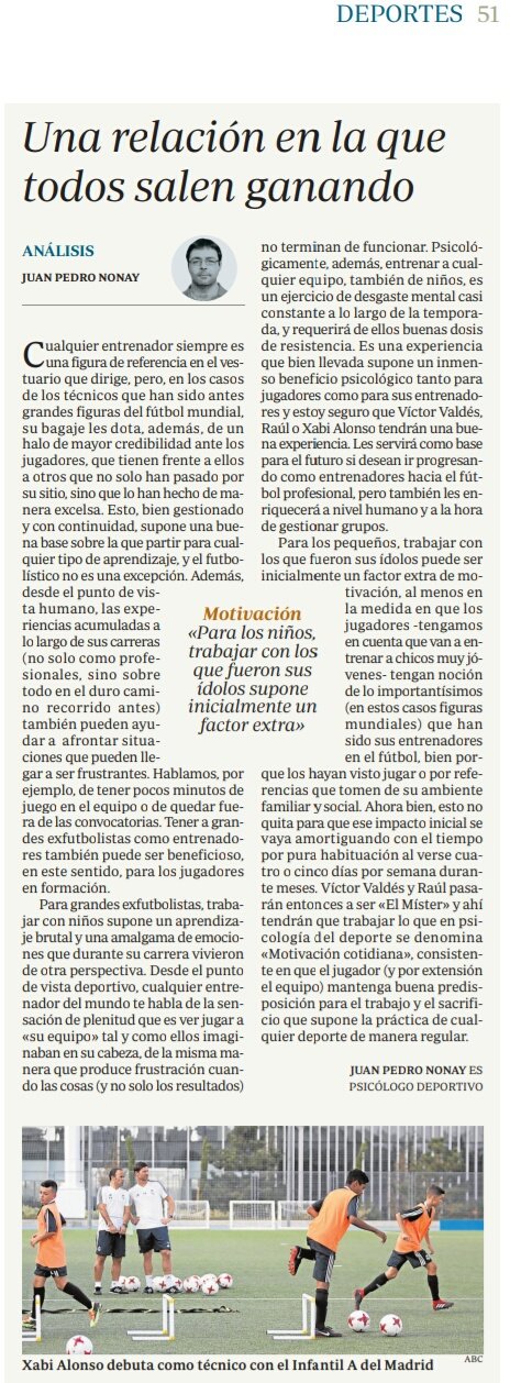Articulo del Diario ABC (digital y papel a nivel nacional) sobre la figura del Psicólogo Deportivo en los clubes de fútbol https://www.abc.es/deportes/futbol/abci-psicologos-vestuarios-futbol-base-proceso-imparable-201811200227_noticia.html